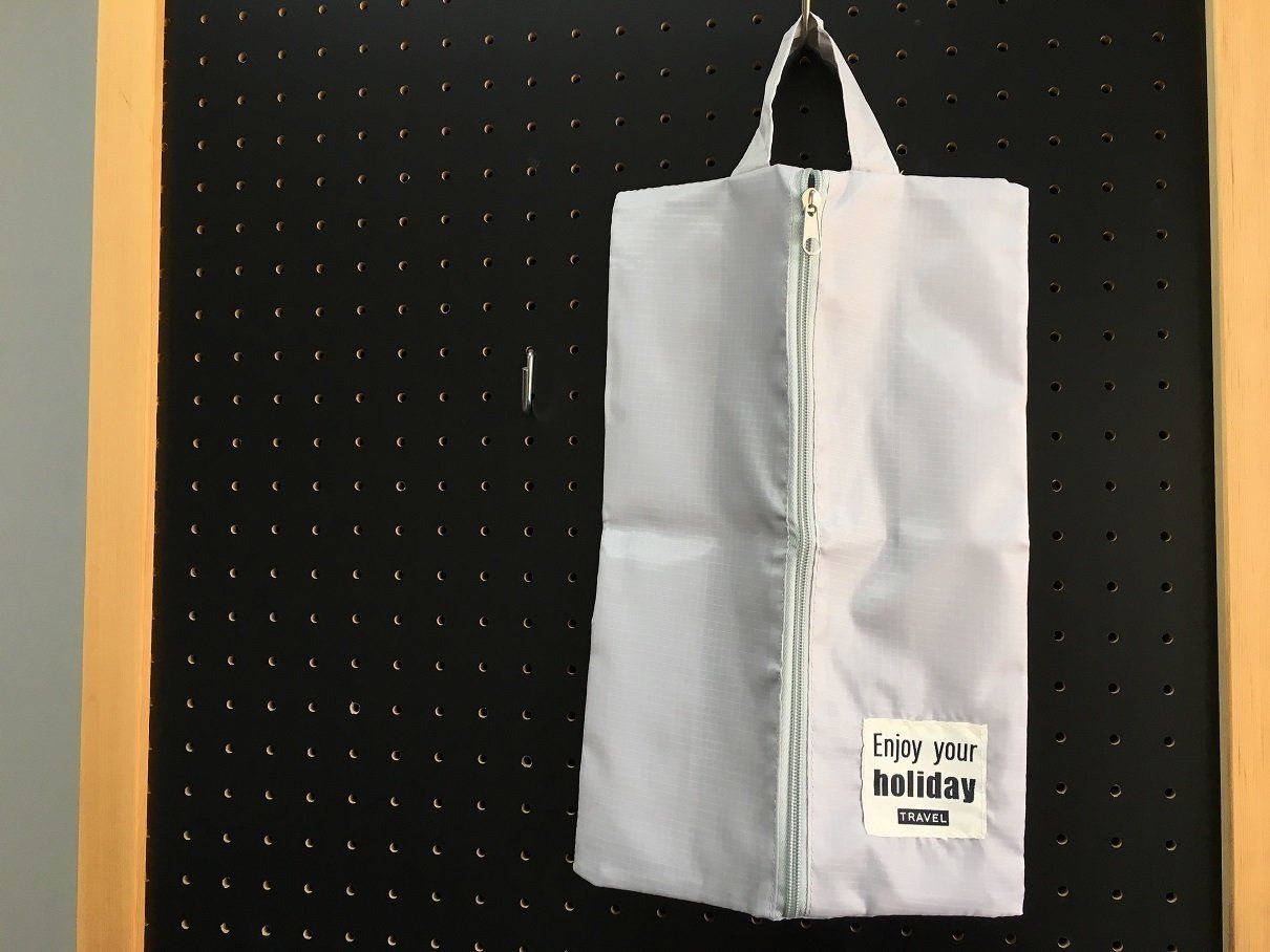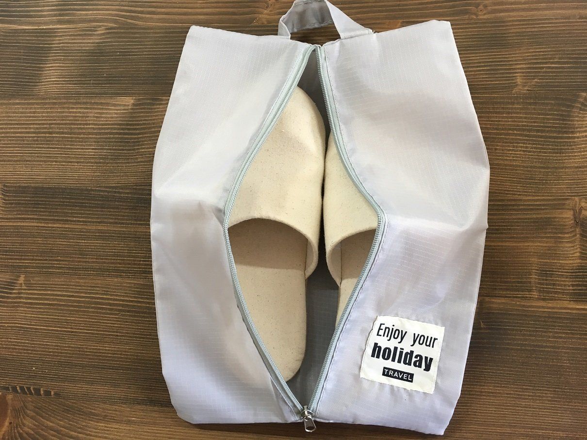 続いて紹介する「シューズバッグ」は価格462円。移動先で靴をはきかえたいときにも便利です。サイズは37×23×12cm。マチがしっかりあり、中央にファスナーがついているので、ここから出し入れします。