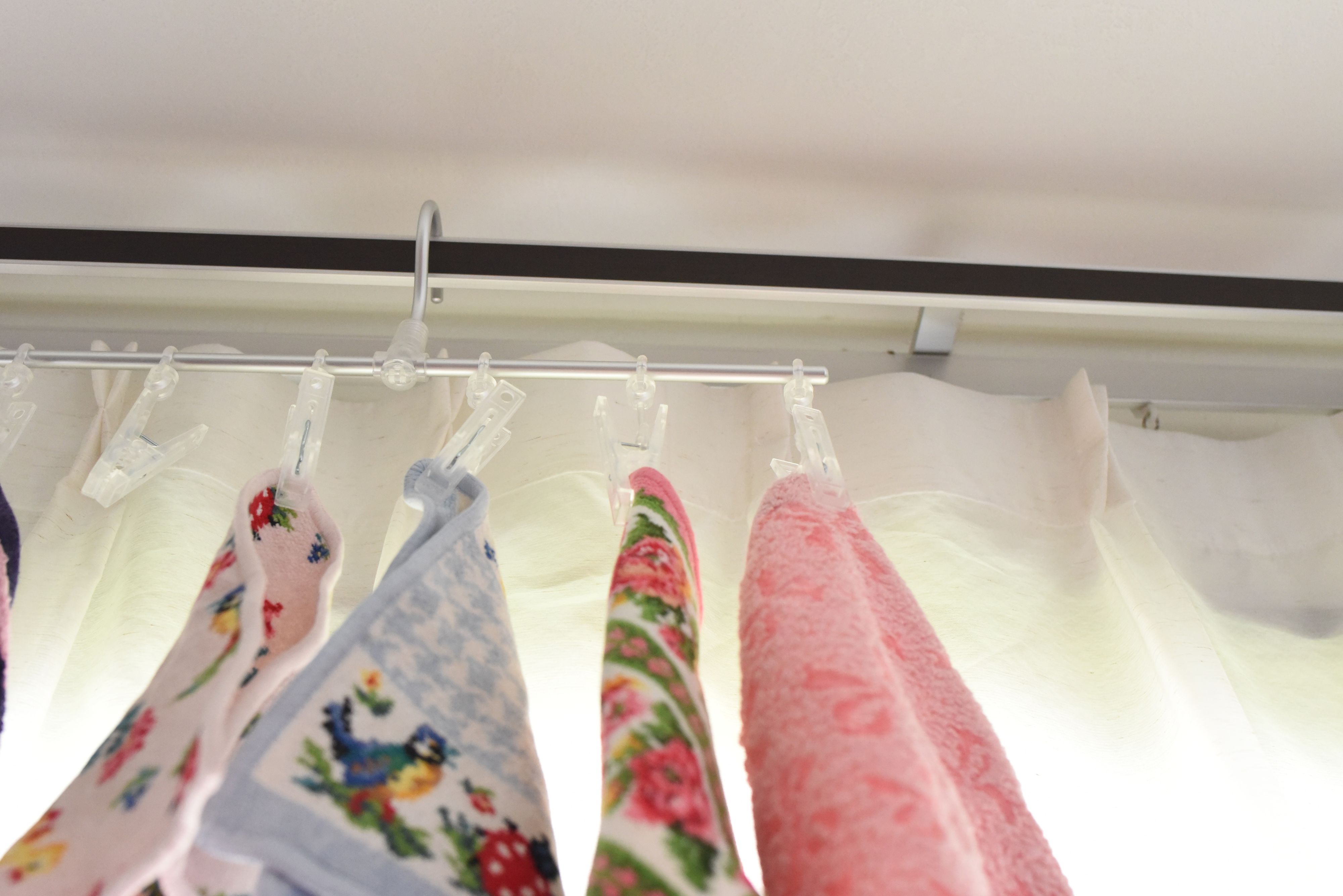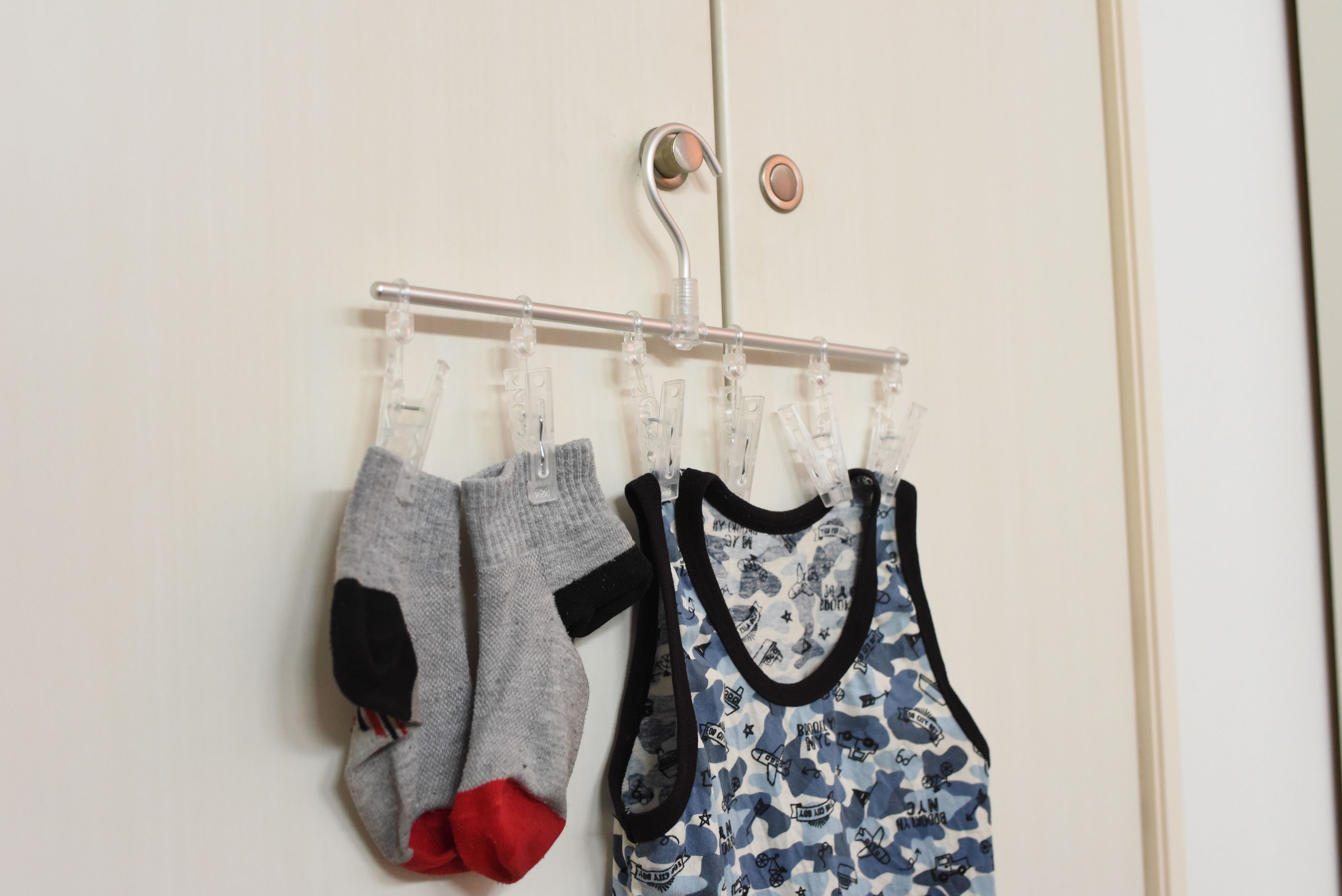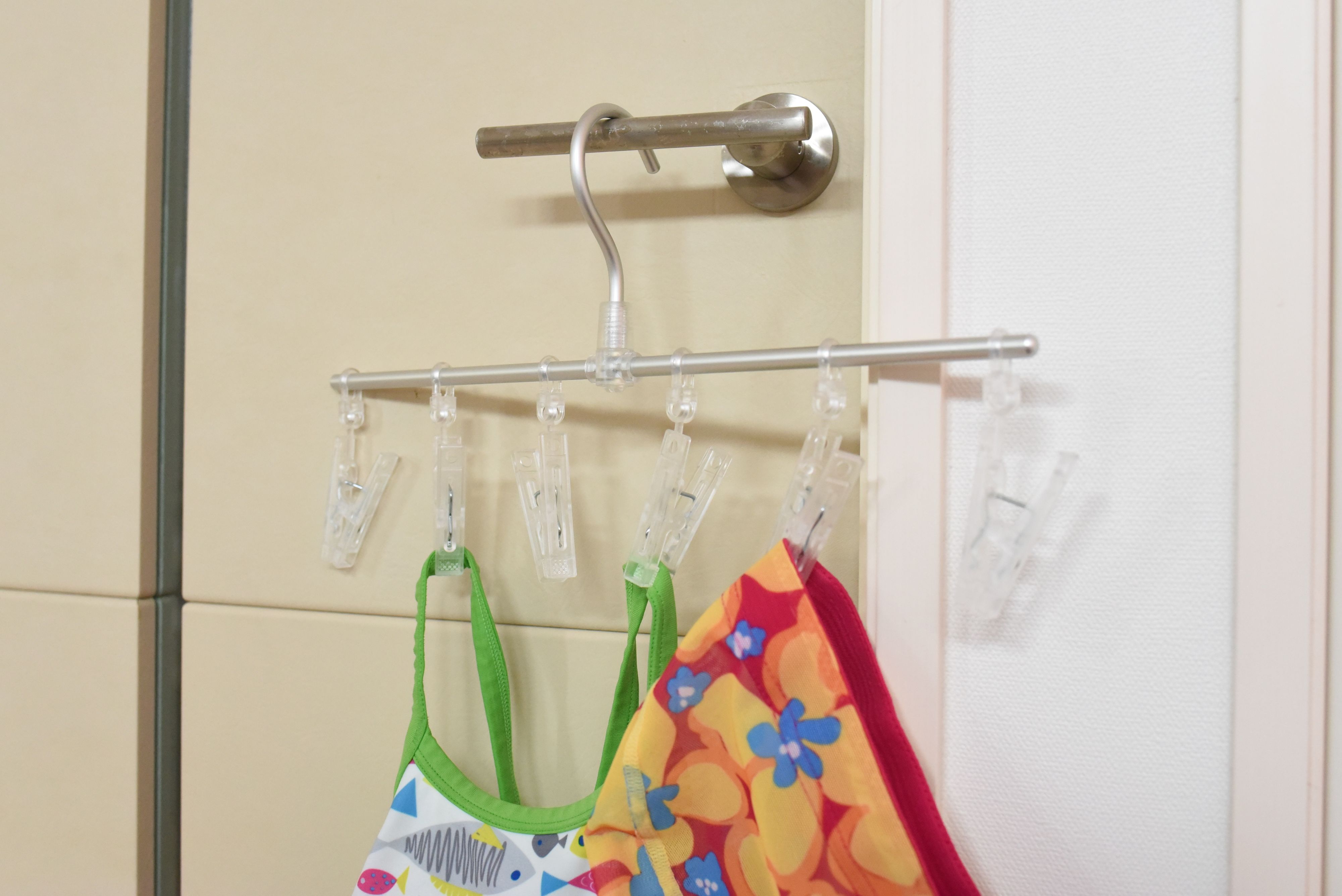 直線ハンガーがあれば、ドアノブも干し場所に。