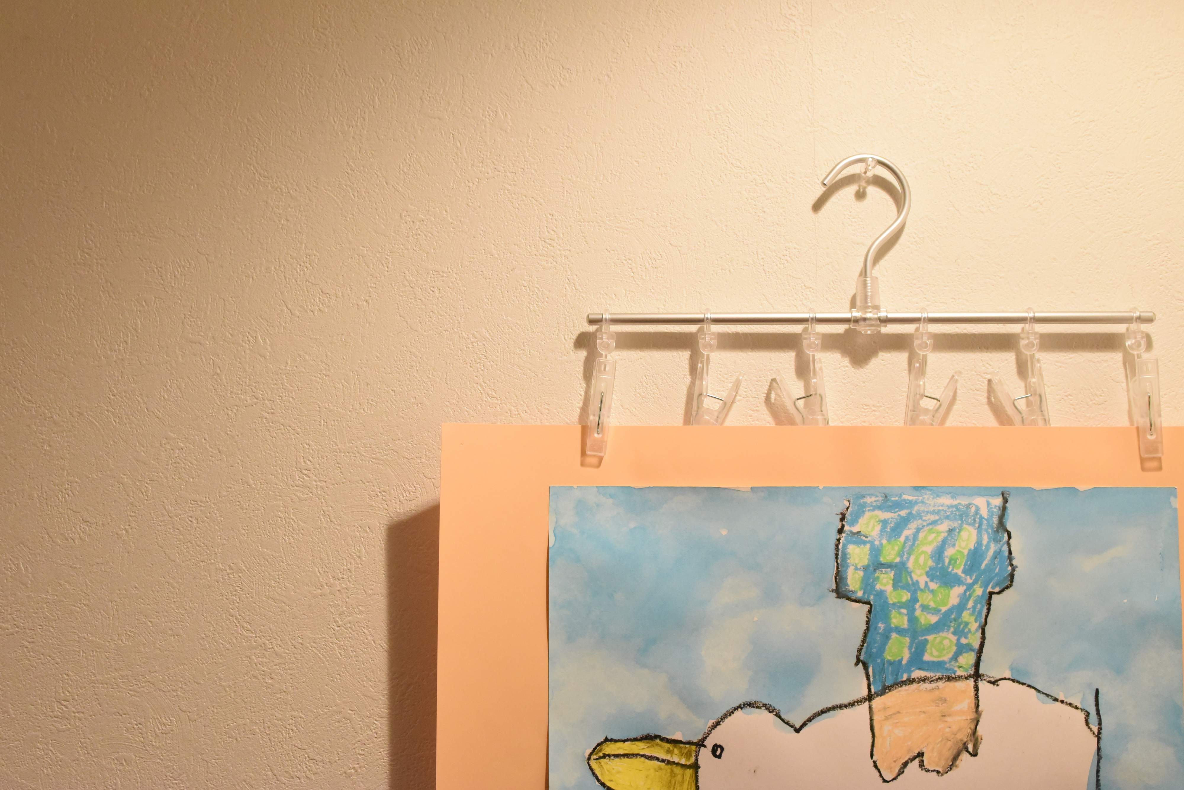 子供たちの作品や賞状は、できるだけ飾ってあげたいですね。でも、額を買うのと高いし、飾るものによってサイズが変わるし、手間がかかります。そんなときにも、アルミ直線ハンガー。ピンチが6つあるので、サイズに合わせて止められまし、軽量なので画びょう1つでも安定してかけられます。