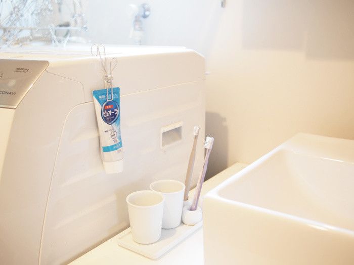 毎日使う歯磨き粉は置いておく場所に悩んでしまうもののひとつですね。立てて置いておくと気づいたら倒れていたり、寝かせて置いていると、残り少なくなったときに絞り出すのがめんどうだったり…と地味に悩ましい存在ですが、こちらもステンレスひっかけるワイヤークリップで解決!ずっと立った状態のまま保管でき、最後まで使い切ることができます。