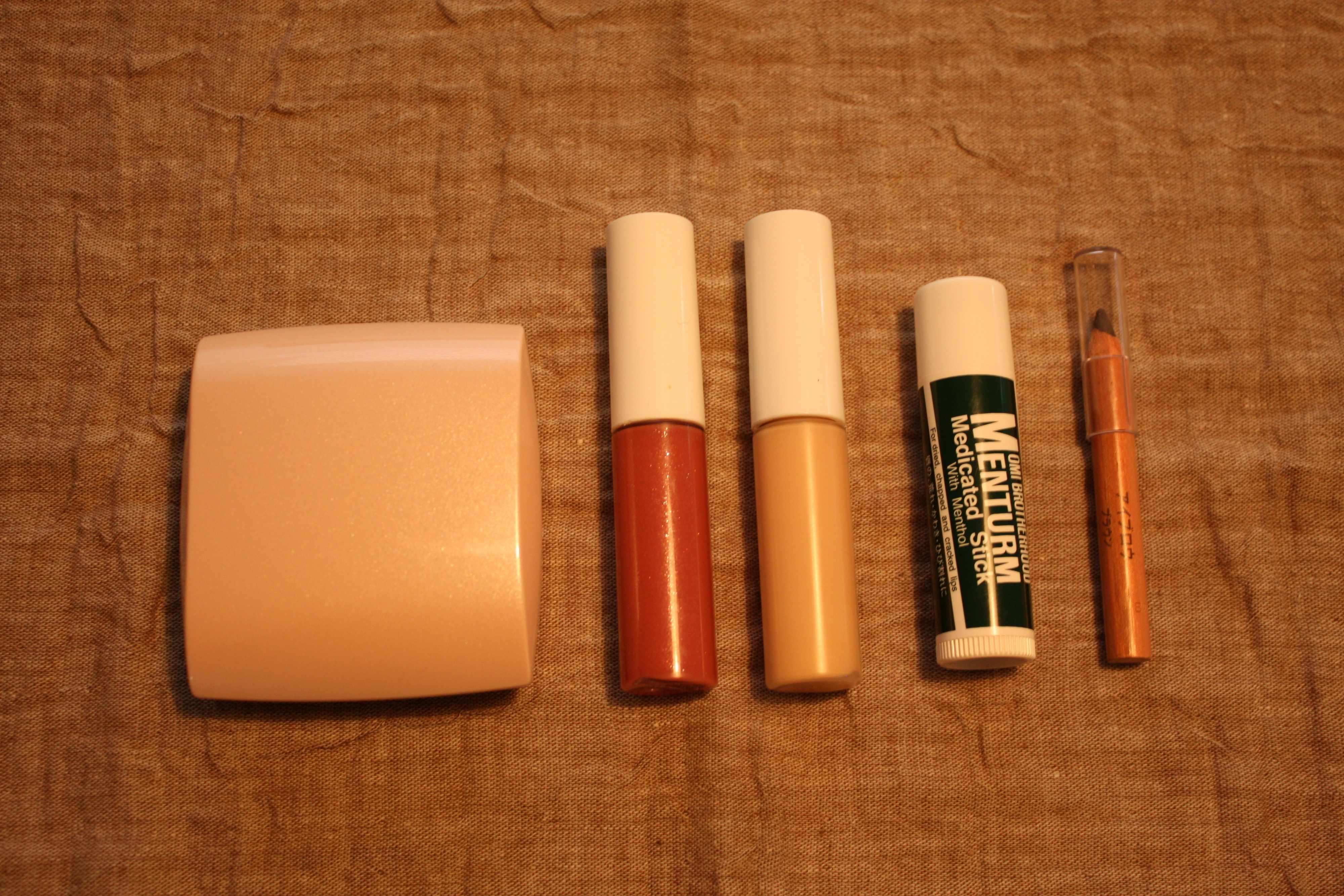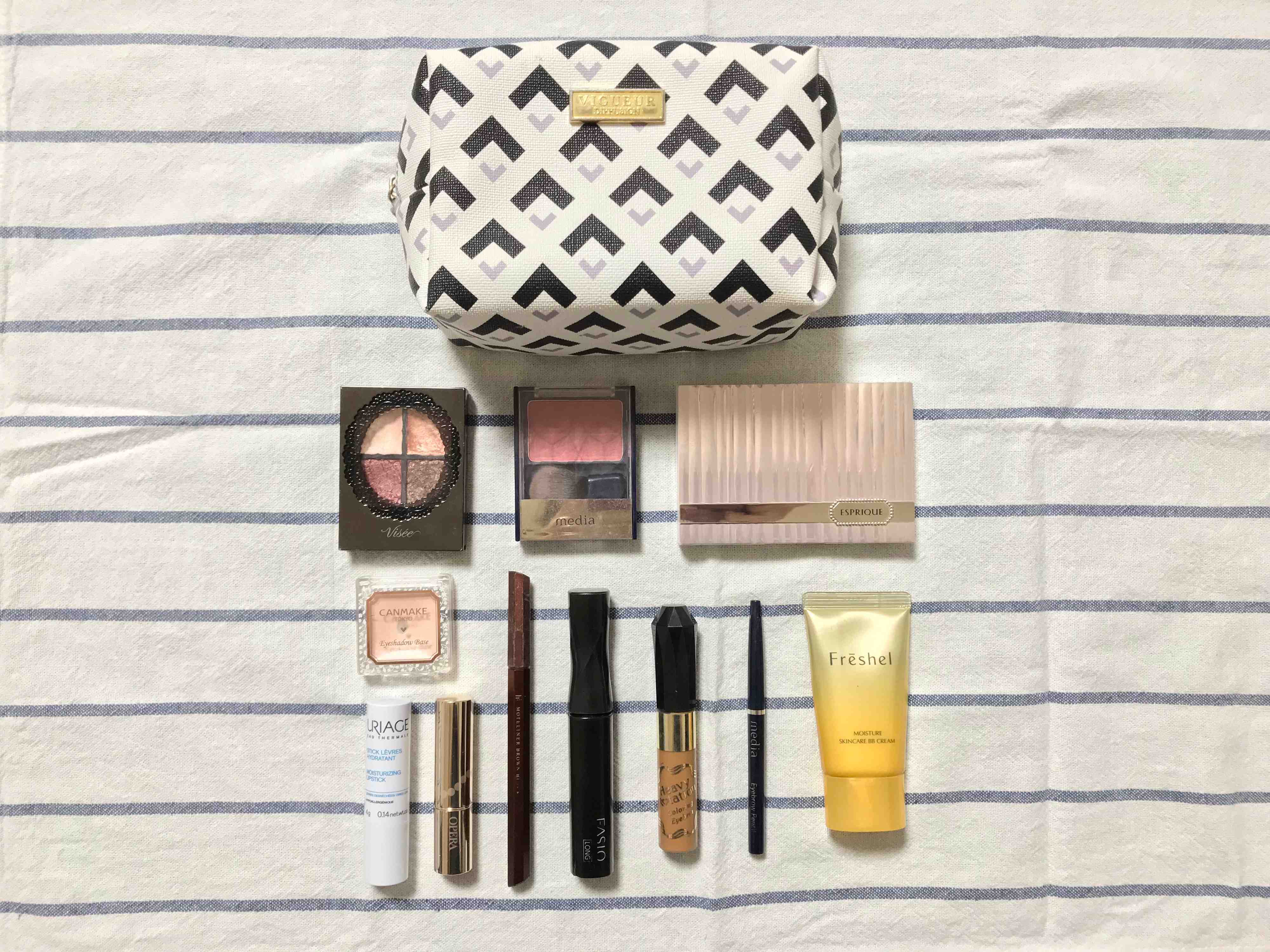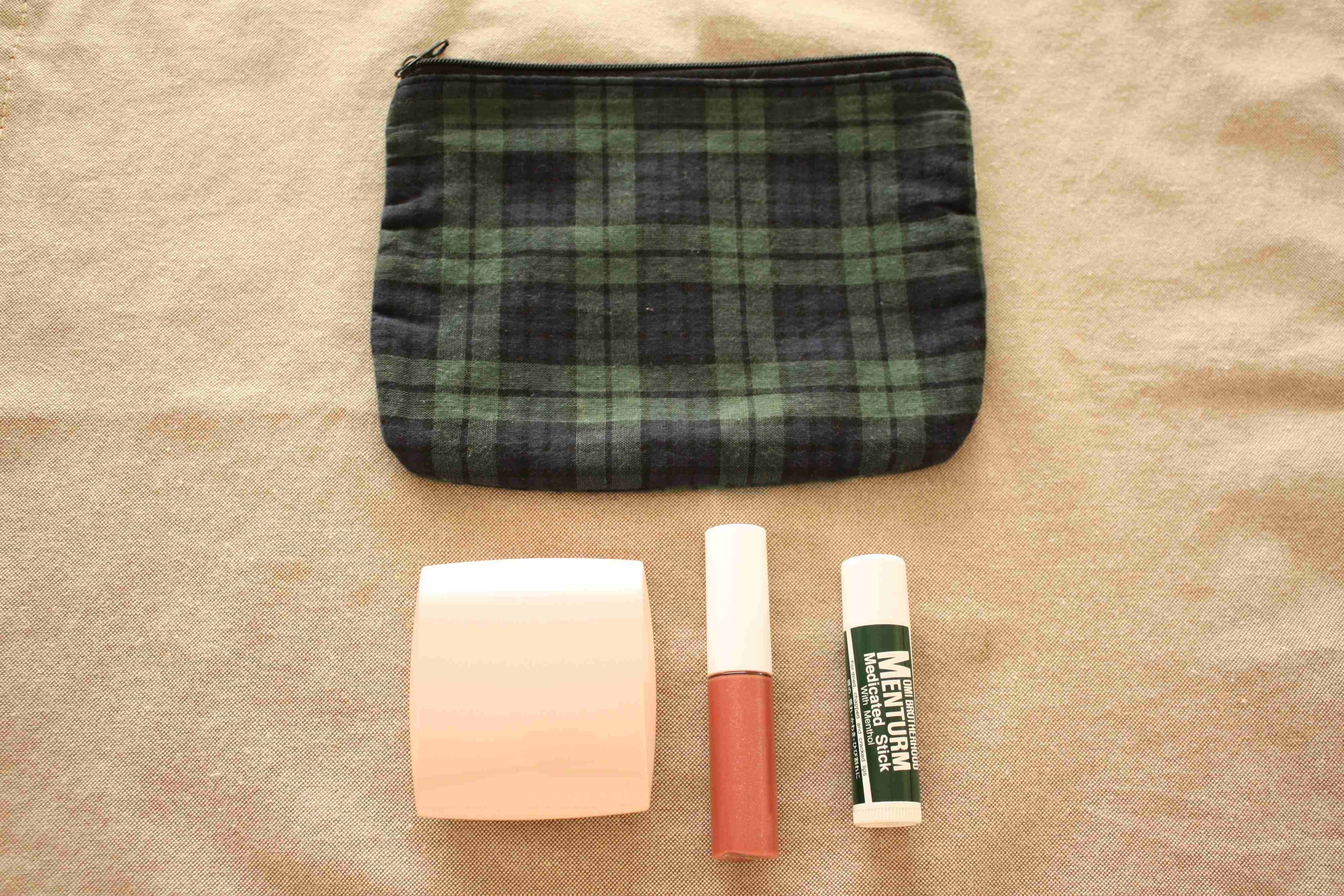 持ち歩くときのアイテムはさらに絞られ、ファンデーション、リップグロス、薬用リップの3つだけ。これなら外出先でもサッとメイクを直せますね。
