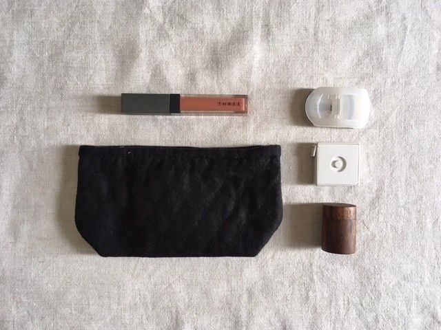 外出時の化粧ポーチの中には、THREEのリップグロス、携帯用ビューラー、オールインワンクリーム(写真:茶色の筒)、メジャー。化粧直しが必要になりそうなときだけ、チークやアイシャドウなどを追加するそうです。