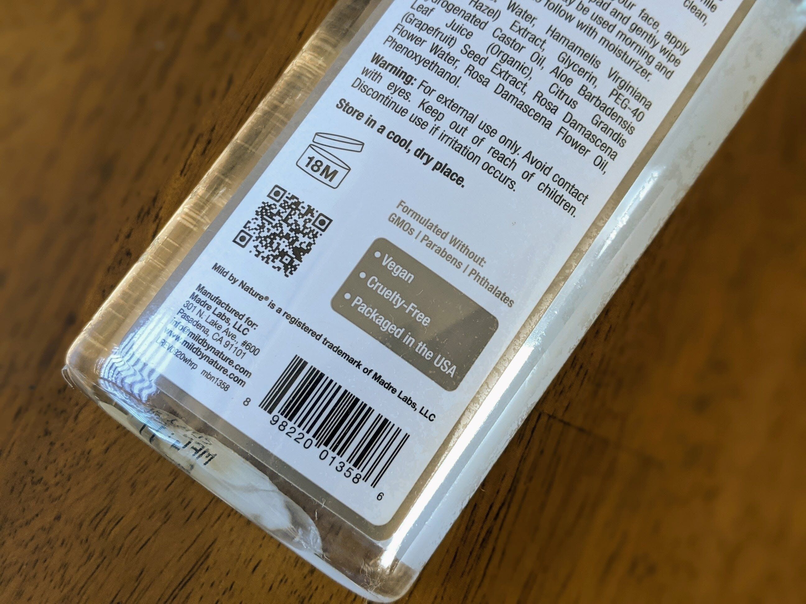 成分は水、 ハマメリス(ウィッチヘーゼル)エキス、 グリセリン、 PEG-40水添ヒマシ油、 アロエベラ液汁(オーガニック)、 グレープフルーツ種子エキス、 ダマスクバラ花水、 ダマスクバラ花油、 フェノキシエタノール。