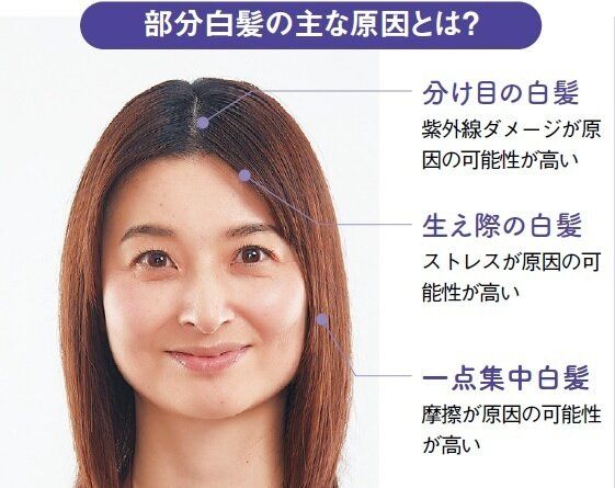白髪の原因は、遺伝、加齢、生活環境、ストレスなどが考えられています(髙瀬先生)、一部分だけに集中して生える白髪は、外的要因が影響していることが多いため、下記の原因を取り除くことで改善する可能性大。(田村さん)