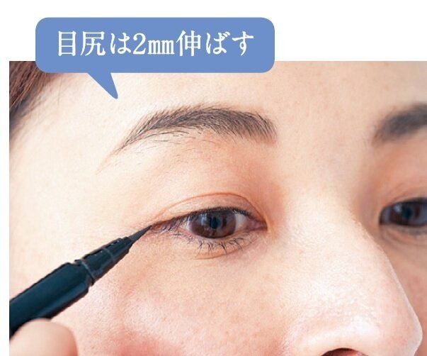 ポイントはあくまでも自然なラインをつくること。元々あるラインの1mmくらい上に貼ると、ナチュラルな仕上がりに。アイブロウやアイラインで、眉や目の輪郭をクッキリさせるといっそう効果的です。