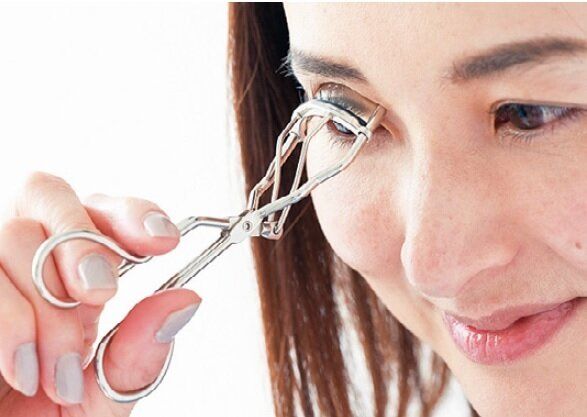 根元からまつ毛をはさんで、ビューラーをまぶたに押し込むようにしてカール。顎は引き、手首を上に返すように動かす。まつ毛が根元から立ち上がり、たるんだまぶたのリフトアップ効果が。