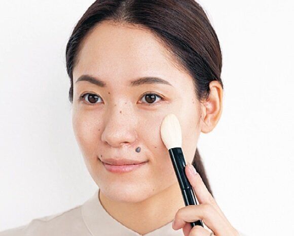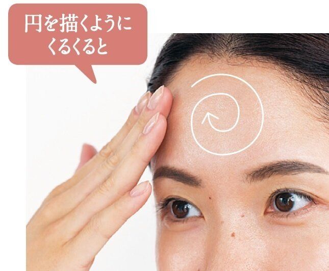 前から見たおでこの形は、生え際が影響します。まず、生え際にツヤの出る下地を塗って、丸みのある形に整えましょう。このとき、おでこのカーブを意識して円を描くように丸く塗るのがポイントです。さらにハイライトやパウダーで自然な陰影をたします。おでこの角を消すようなイメージで、理想的な卵形をめざすと、ツルンと丸い、おでこ美人に仕上がります。
