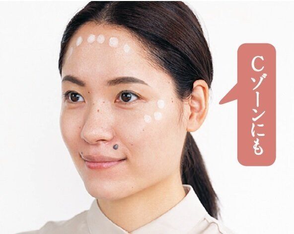 おでこを丸く見せるため、ハイライトを生え際のカーブに沿って点状にのせ、スポンジでポンポンとたたき込む。目尻から頬骨のCゾーンも同様に。