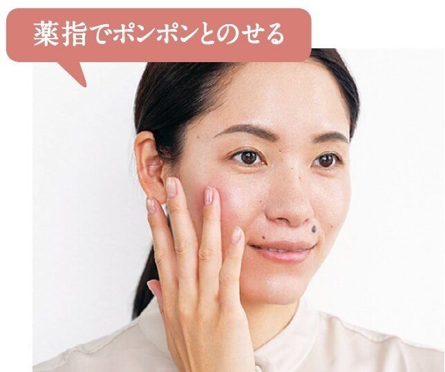 チークも高めの位置にのせるのがポイント。頬骨に丸い大きな円を描くように広げる。軽いタッチで薄めにのせると丸みのある柔らかい印象に。