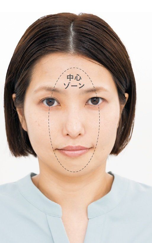- 1 顔の中心ゾーンに皮脂ブロック下地を塗る