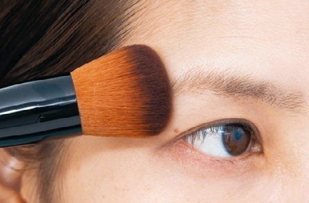 最後にファンデをブラシでのせる。アラが目立つ、目の下の三角ゾーン→Tゾーン→小鼻の順に、クルクルとブラシを動かし、お粉をON。最後に、シミなどが気になる部分は重ねづけをしてピンポイントでカバー。