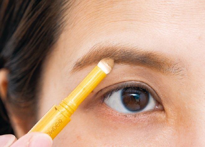 ブラシにファンデを取り、眉の上をなぞる。このひと手間で余分な皮脂が取れ、眉に色がのりやすく。
