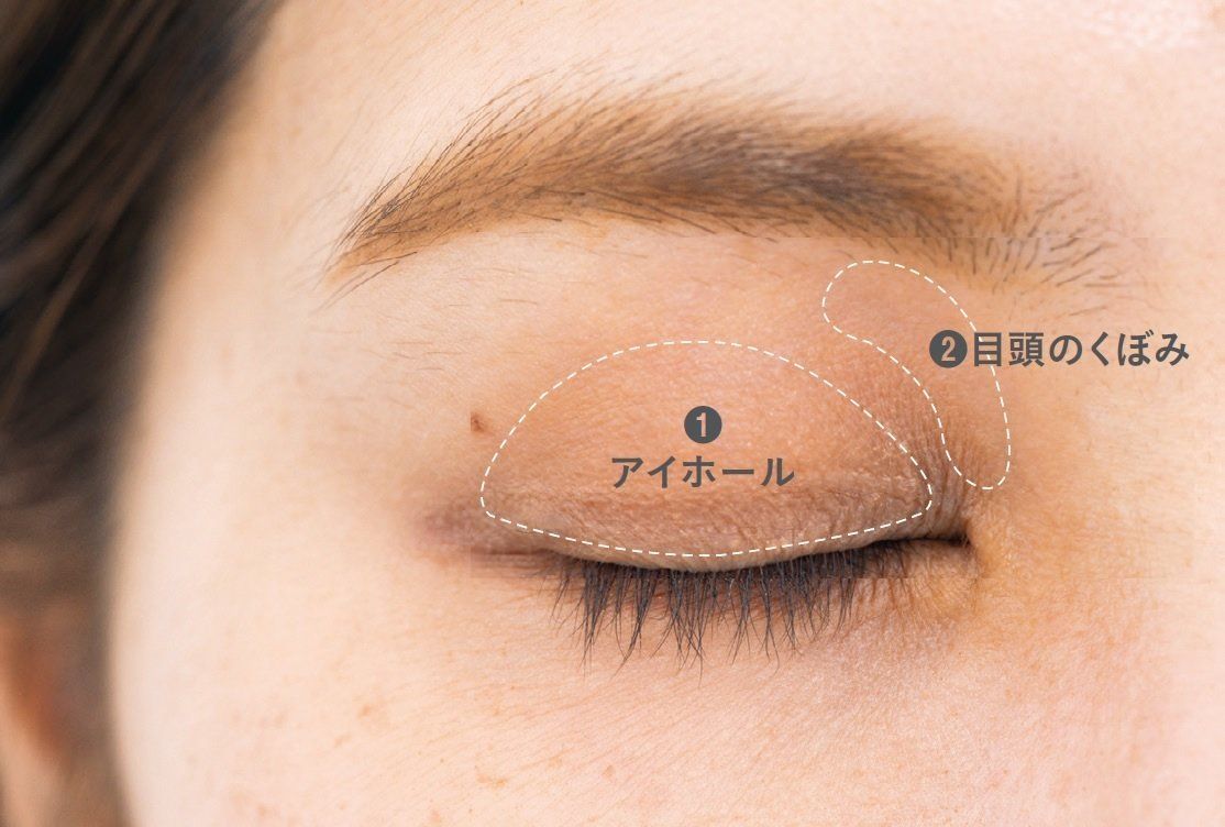マットな質感のブラウンシャドウを、まぶたの際からアイホールに広げる。そのまま目頭のくぼみにほんのりにじませ、立体感を強調。