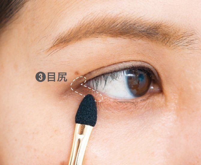 上下のまぶたがちょうど重なる目尻の三角形に締め色をチップで「く」の字になるように入れる。