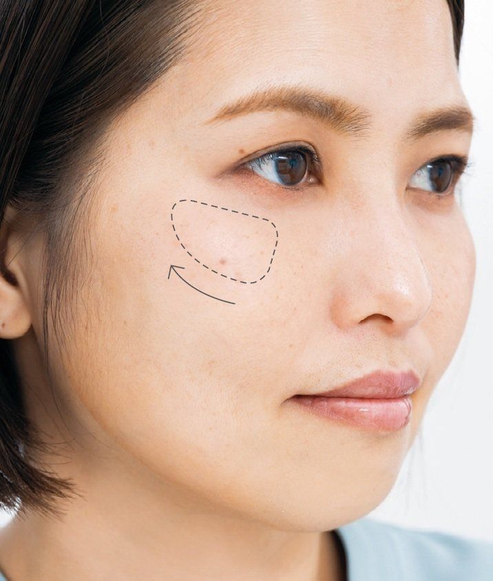 頬はほんのり血色感を。淡いベージュを頬骨の上に薄~く丸くのせ、外側にぼかす。あくまでも主張させず、広範囲にのせないこと。