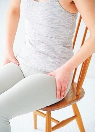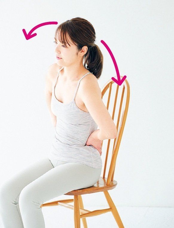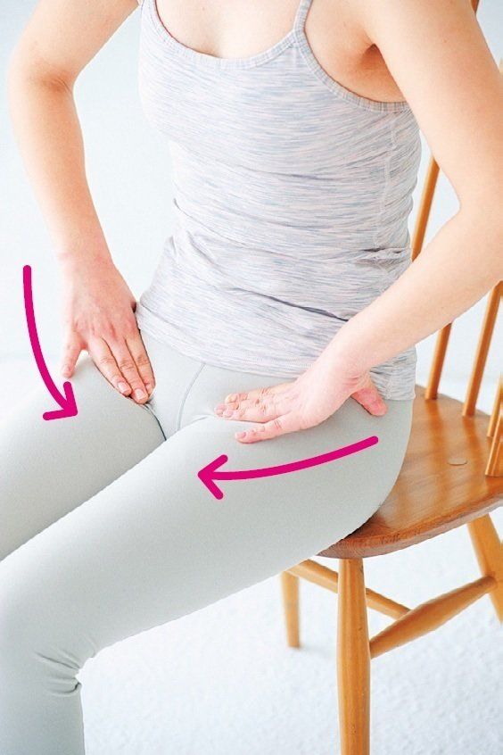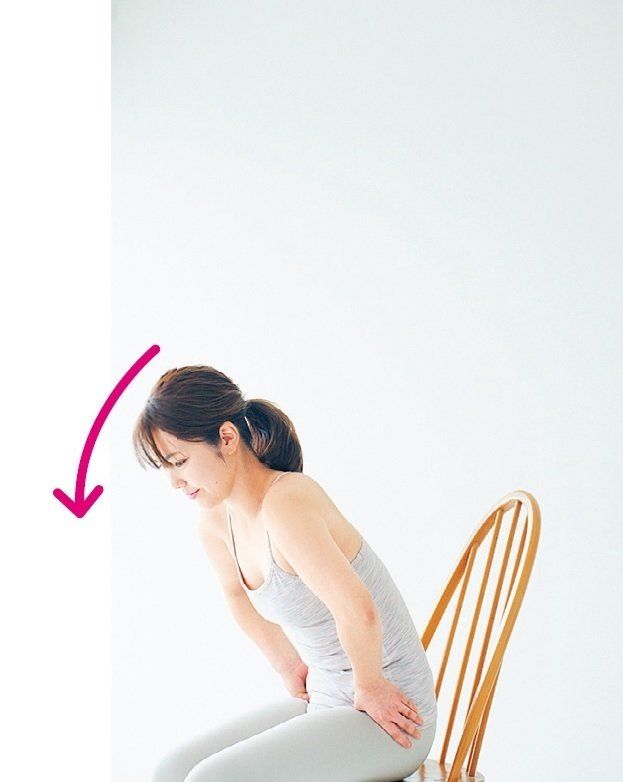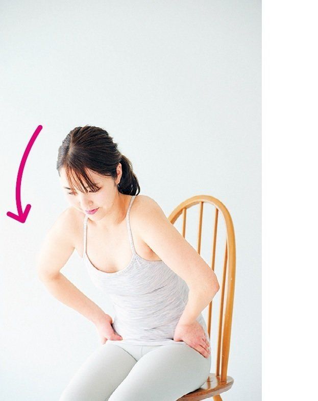 いすに浅く腰かけ、両手の親指を前にして腰骨の上に当て、4本の指を腰骨の後ろのほうに当てる。