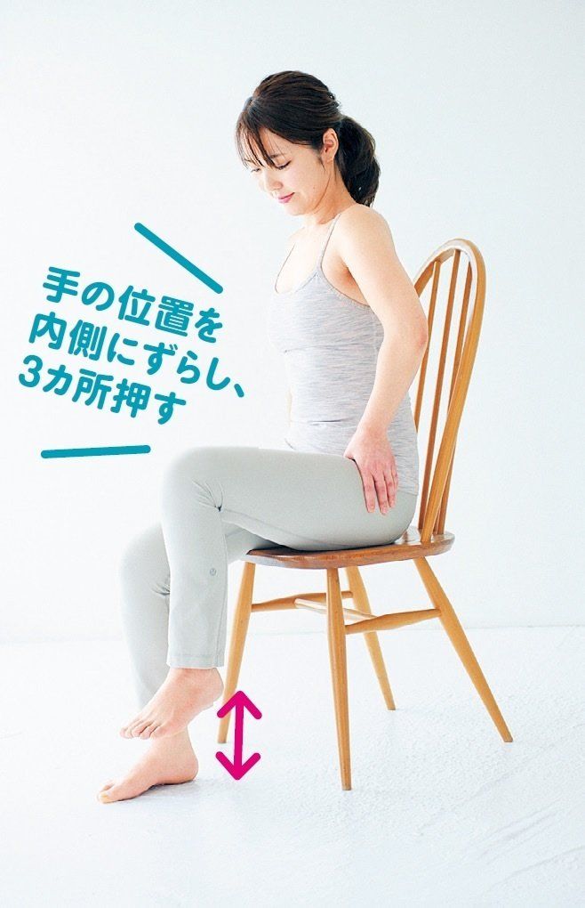 両手の親指を脚のつけ根の端に当て、4本の指で腰の下をつかむ。親指で圧をかけながら、3秒間上体を倒す。3回行う。