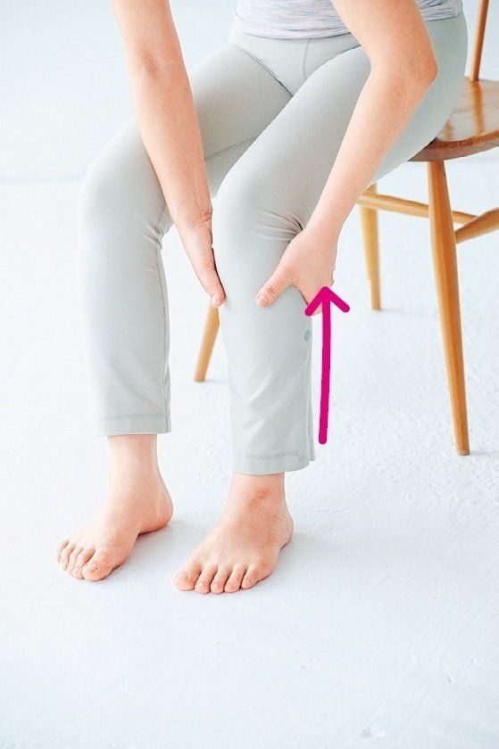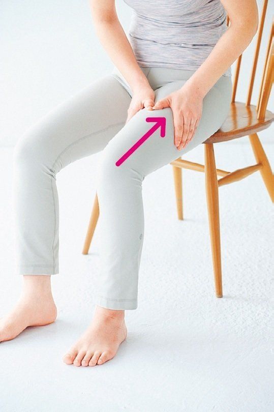 両手の親指を脚のつけ根の端に当て、太ももの外側をつかむ。