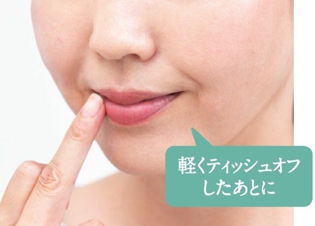 2のマルチカラーを唇にも塗って色をたす。軽くティッシュオフしたら、次にリップコートを指でトントンと重ねて。このひと手間でマスクへの色移りも気になりません!