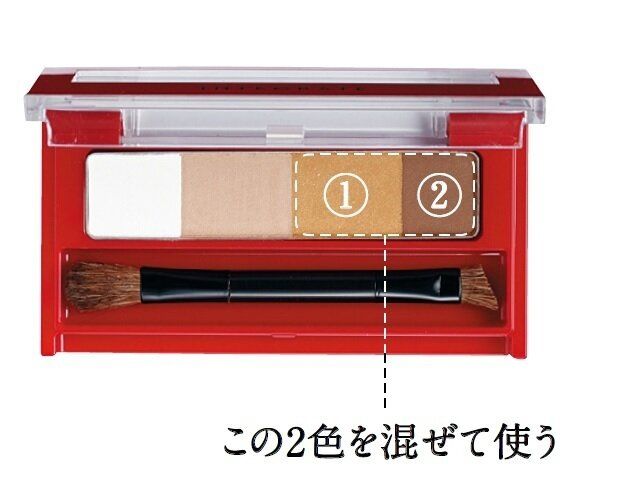 パレットの右から2番目の(1)ライトブラウンを2回、いちばん右の(2)ブラウンを1回ブラシに取って混ぜる。そのまま毛流れに沿って、ブラシを上から下になでるように色をのせていく。