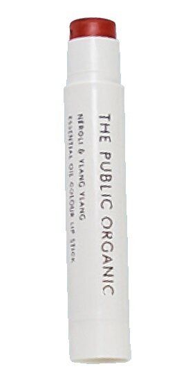100%天然由来成分を使用。顔色を明るく見せるテラコッタレッド。「ザ パブリック オーガニック精油カラーリップスティック スーパーフェミニン バーニングレッド」¥648/カラーズ