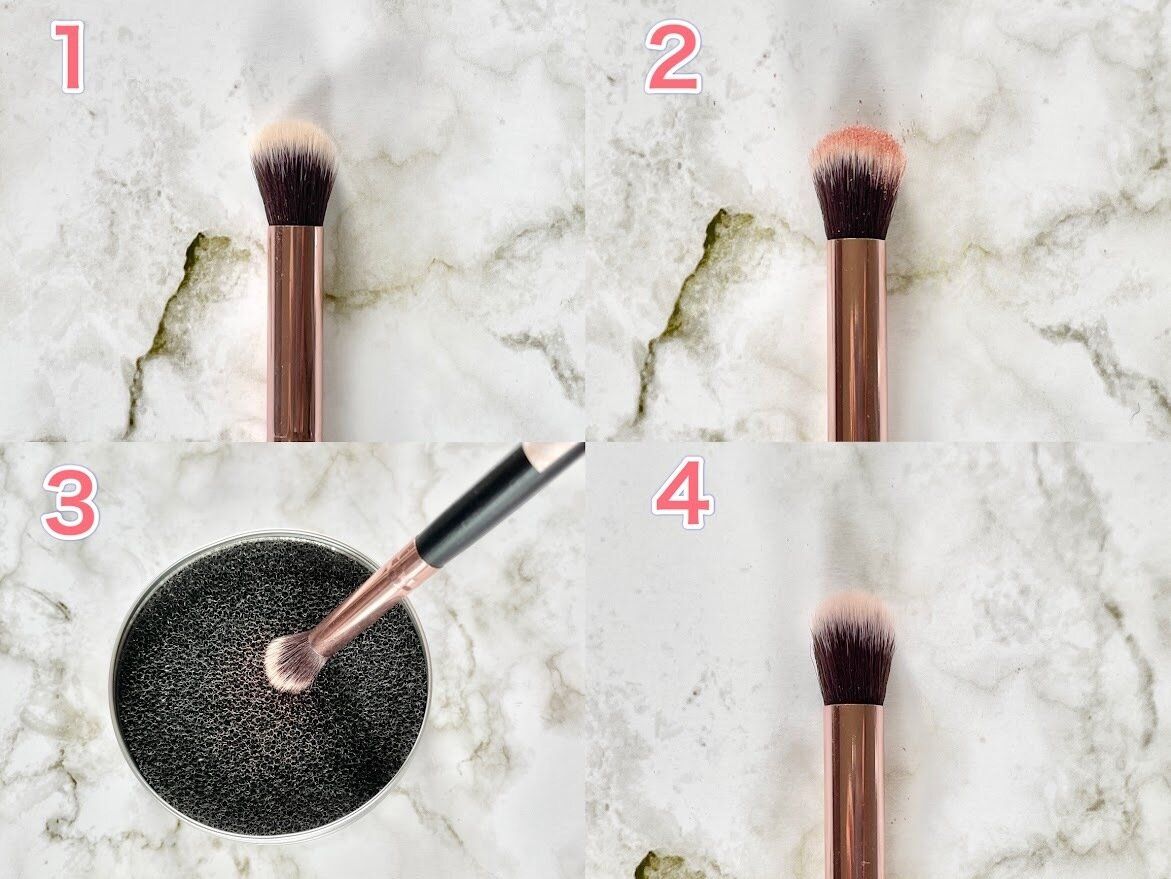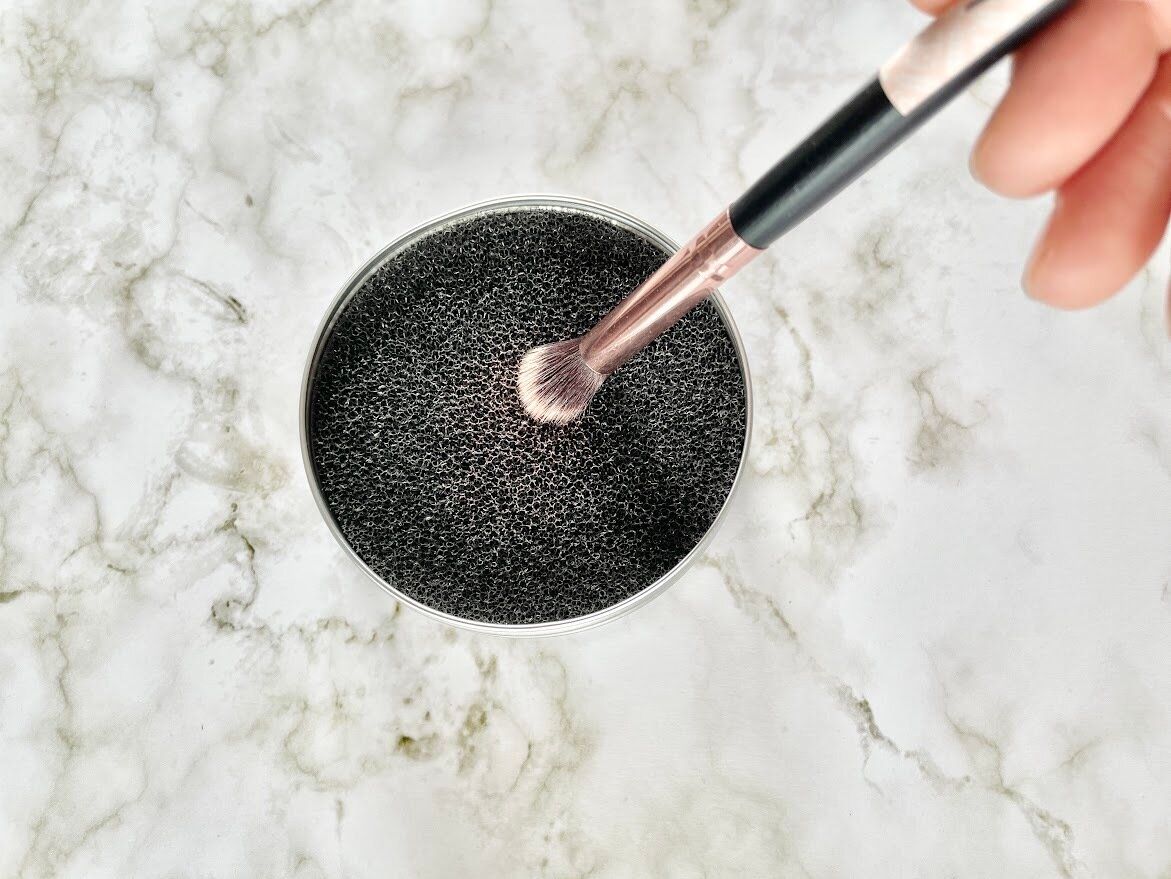 「ドライメイクブラシクリーニングスポンジ」を使えば、スポンジの上でこするだけで、ブラシのリセットがでちゃいますよ。