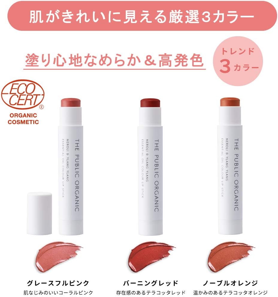 - ザ パブリック オーガニック 精油カラーリップスティック 全3色 各¥648(税抜)