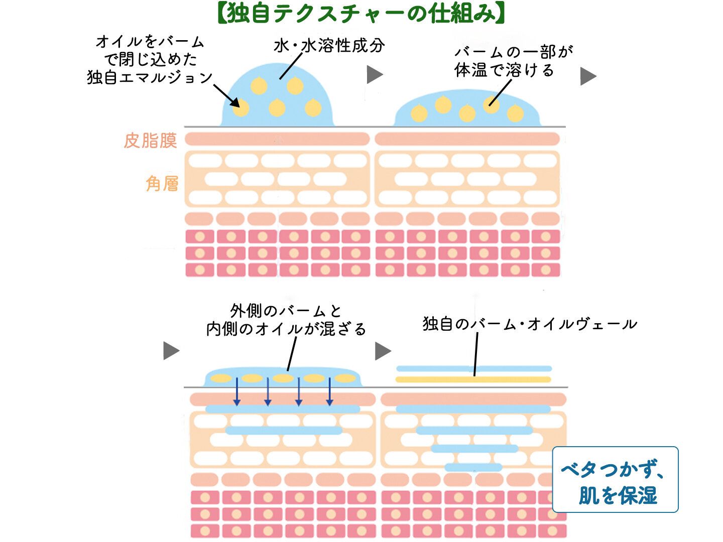 この独自のエマルジョン(乳化技術)に加えて、エモリエント効果を期待する7種の油脂が配合されており、その中には保湿だけでなくサラサラなテクスチャーに繋がる成分が入っているため、ベタつかずに保湿することを可能にしました。7種類の油脂を独自の配合バランスでブレンドすることによって、ほかにはない驚きのテクスチャーを実現しました。その独自の配合バランスは特許も取得しています。