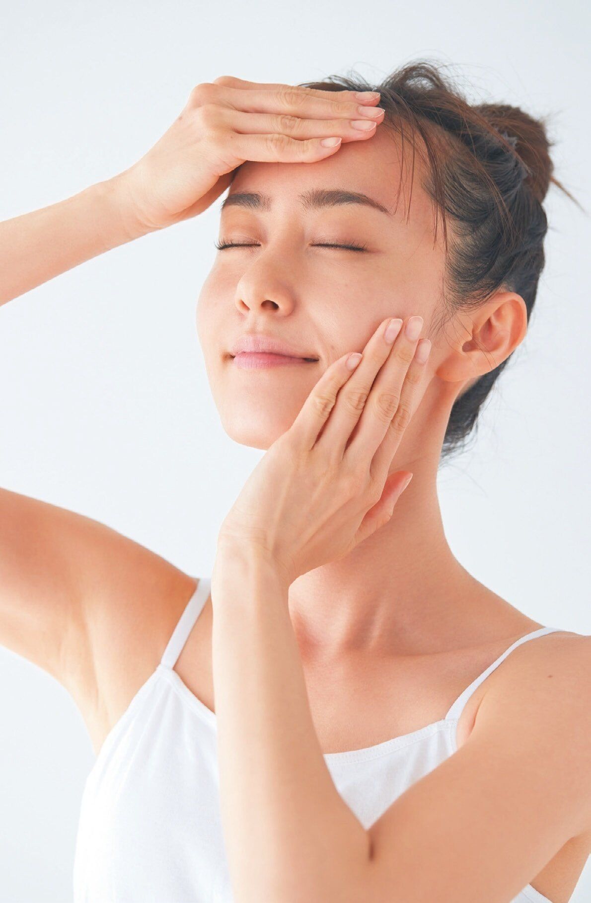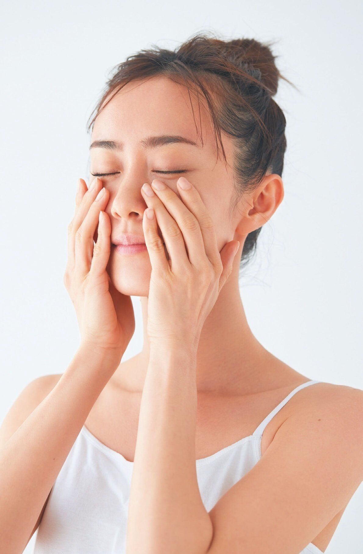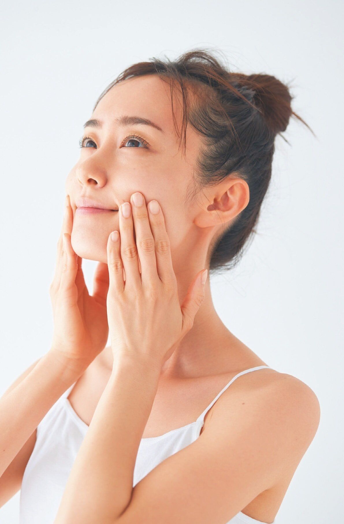 クリームを厚めに塗って、顔全体をマッサージ。鏡を見ながら、内側→外側、下→上へと、ハリを出したい部分を引き上げるように手を動かすのがポイント。