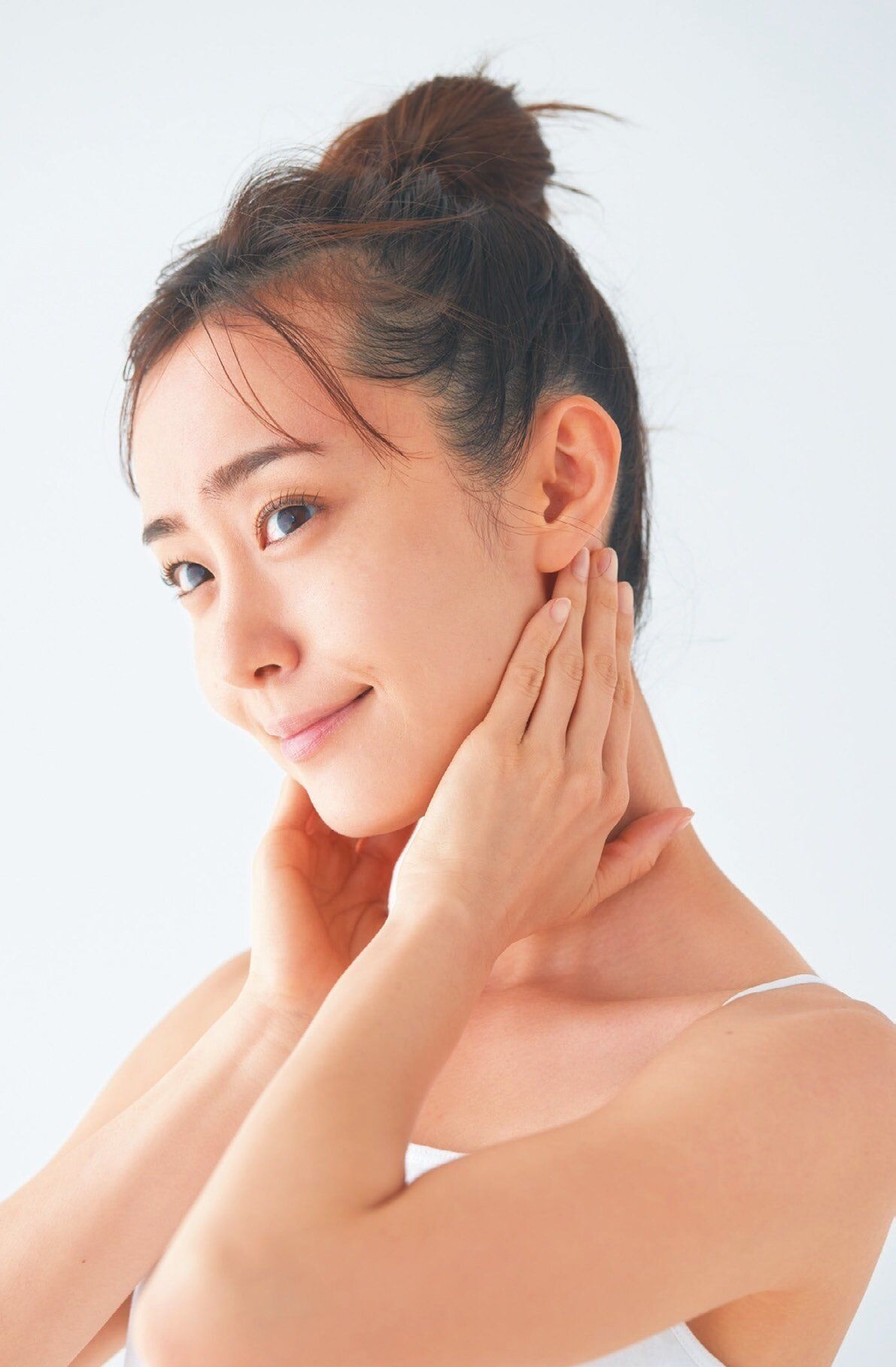 肌の透明感をアップするには、美白ケアが必須。いつもの化粧水を美白タイプに変えてシミ対策を。日差しで乾燥しやすい頰の高い部分から馴染ませるのがコツ。