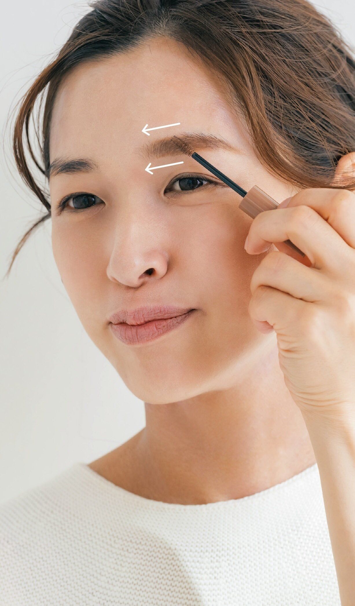 眉マスカラをつけると、たちまちあか抜けた印象に。毛流れとは逆方向にブラシを動かして毛の裏側につけ、立体的な眉に。その後ベタッとしないよう軽く毛流れに沿って整えて。