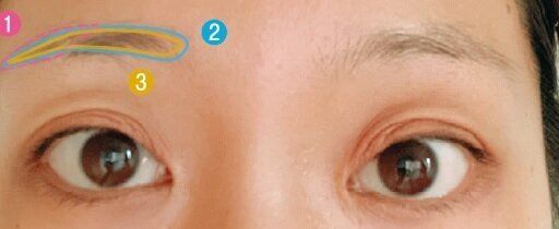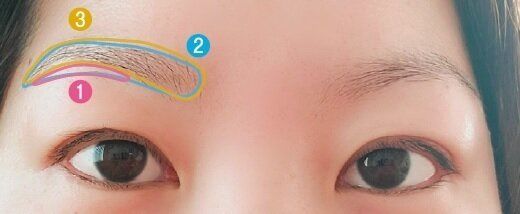 (1)眉頭の幅、高さ、角度を左右で合わせる(2)右側の眉山の位置をもう少し外側に(3)眉山~眉尻をもう少し長く描き足す