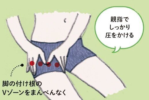 両手の親指の腹を右脚の付け根の内側に置く。そこから外側に向かって、少しずつ位置をずらしながら押す。グリグリほぐしてもOK。左側も同様に行う。