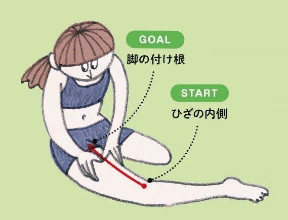 両手の親指の腹を右ひざの内側に置く。そこから太ももの内側を何度もさすり上げる。左側も同様に行う。
