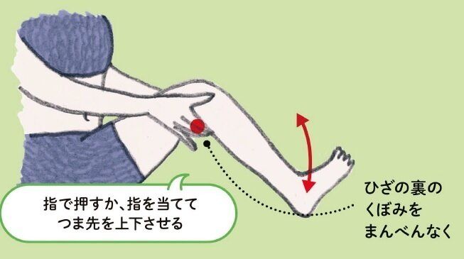 両手の人さし指、中指、くすり指をそろえて、右ひざの裏のくぼみに密着させ、そのまま指で押す。左側も同様に行う。