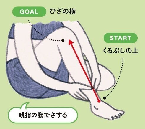 両手の親指の腹を右の外くるぶしに置く。そこからすねの外側をひざまで何度もさすり上げる。続いてすねの内側も内くるぶしからひざまで何度もさすり上げる。左側も同様に行う。