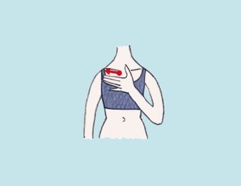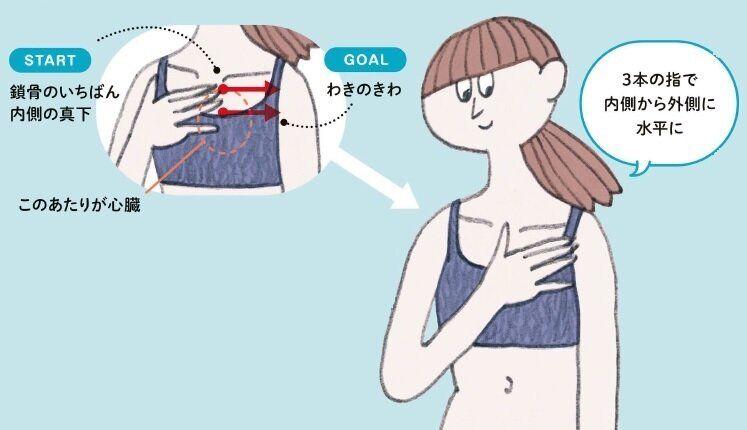 左手の人さし指、中指、くすり指をそろえ、心臓の左上=左側の鎖骨のいちばん内側の下に置き、外側に向けて何度もさする。