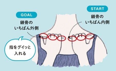 両手の親指以外の4本指をそろえ、鎖骨の上部にあるくぼみに当たる。くぼみの奥に向かって指で押す。鎖骨の内側、中央、外側の3カ所それぞれ10秒行う。