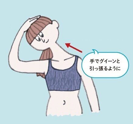 右手を頭の左側に添えて、頭をゆっくり右側に倒す。首の左側が伸びているのを感じながら30秒間そのまま。反対側も同様に行う。