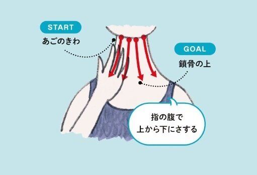 人さし指、中指、くすり指をそろえて、あごのきわに置く。そのまま真下に向かって鎖骨までさする。少しずつ指の位置を変えながら、首の前側全体をさする。片手でも両手でもOK。
