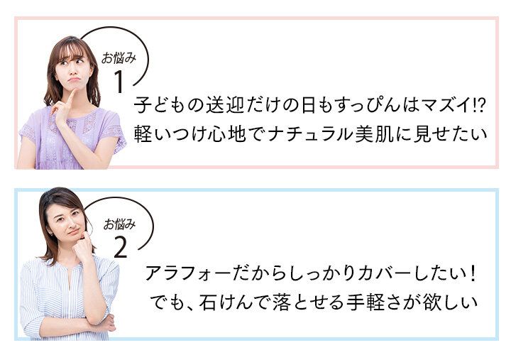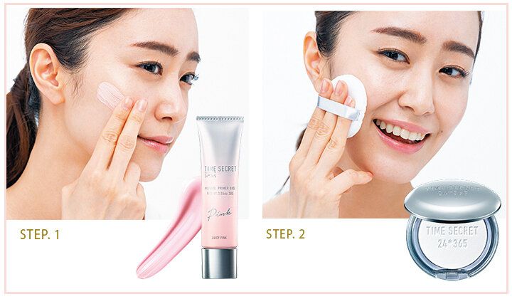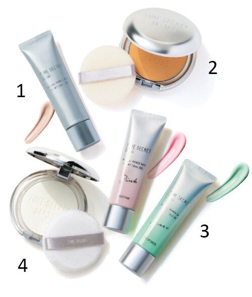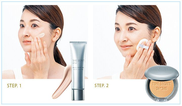 田口さん よくわかります。そこでお二人にぜひお試しいただきたいのが「タイムシークレット」です。こちら、下地+パウダーの2ステップだけなのですが、肌悩みをしっかりカバーしながら、厚塗り感もなくナチュラルな仕上がりなんです。下地もパウダーも色バリエがあるので、お悩みやなりたい肌に合わせて選ぶことができ、すべて石けんで落とせる手軽さです。