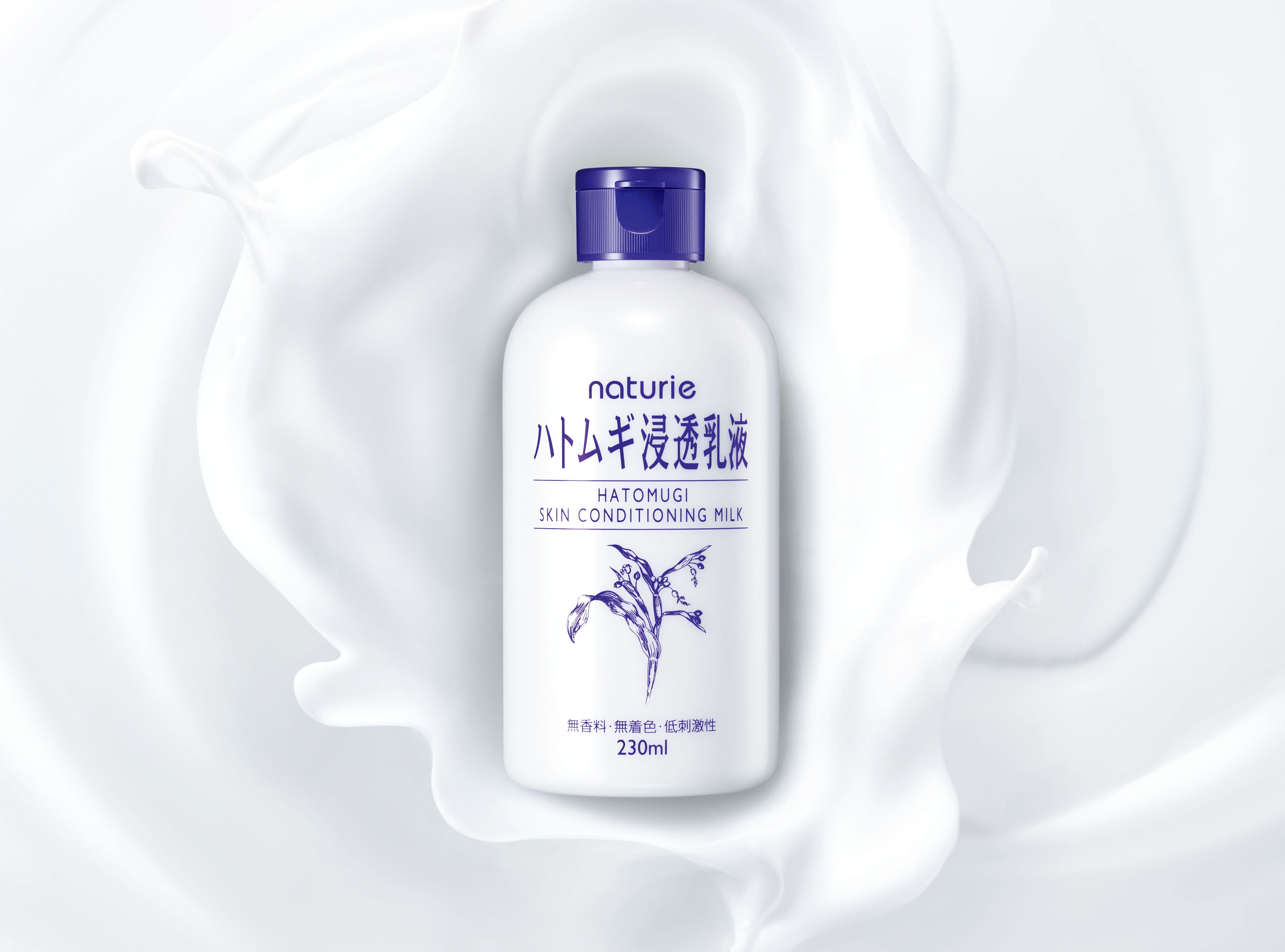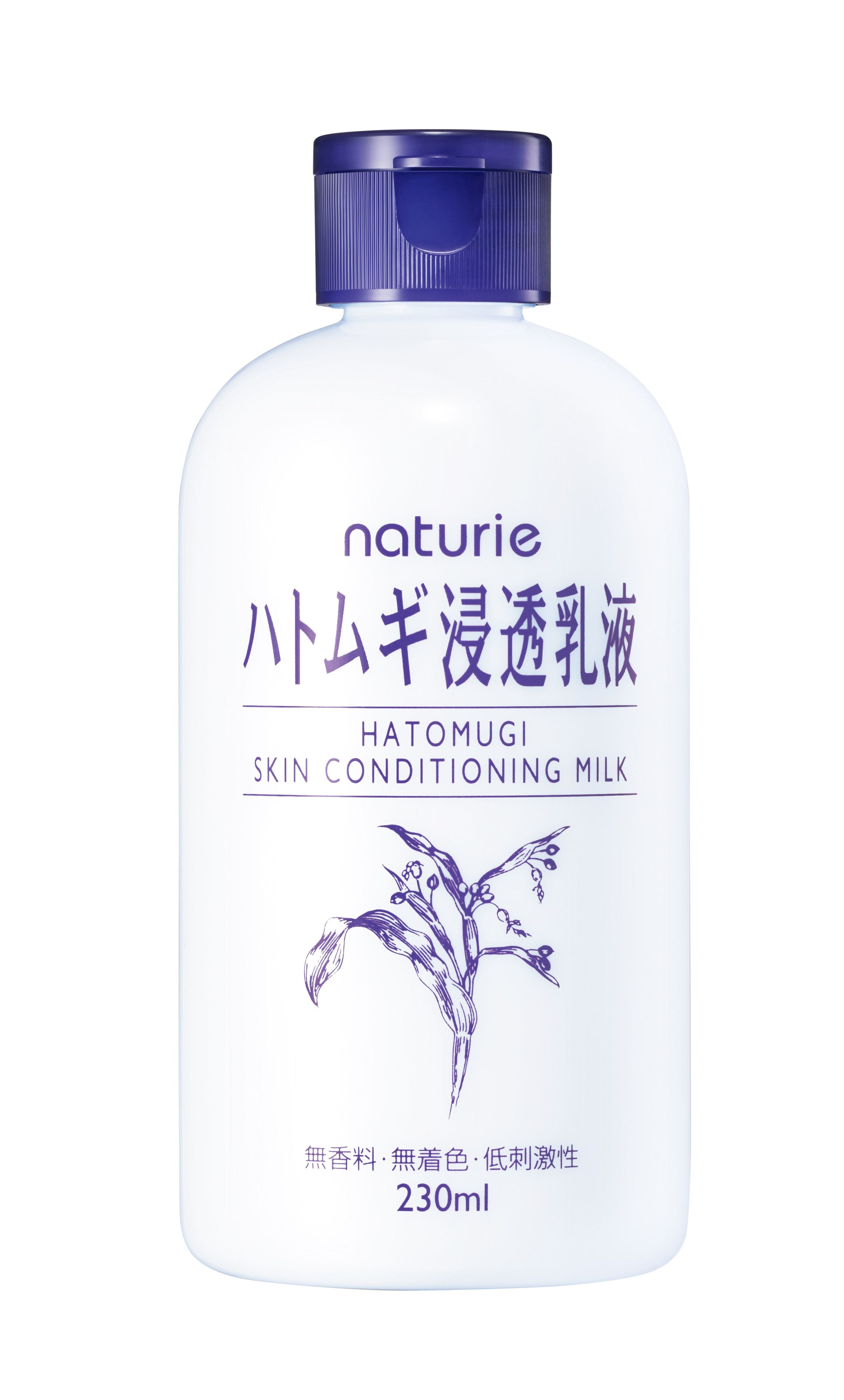 右が新製品の乳液。ナチュリエ ハトムギ浸透乳液 230ml ¥750(9月16日より、全国のマツモトキヨシ・ココカラファイン・ドラッグイレブンにて先行発売)