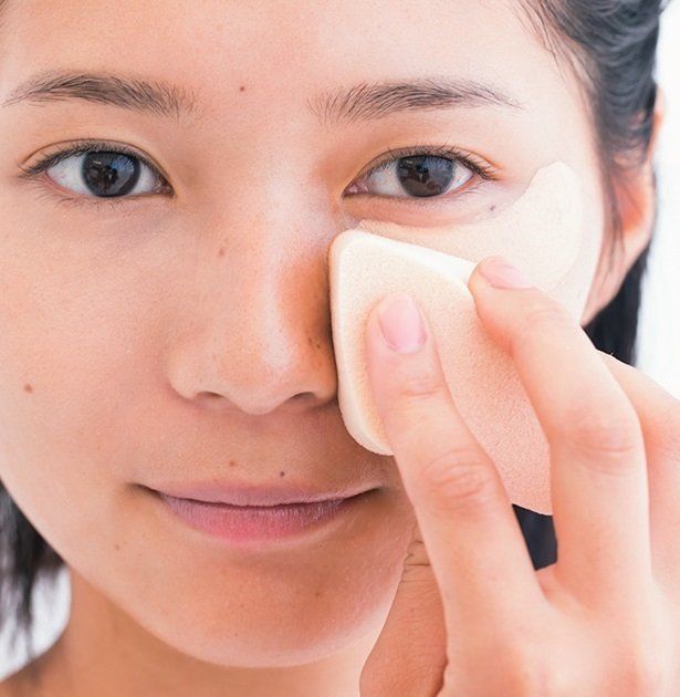 スタンプを押すように細かくたたき、なじませる。ファンデが薄くなるのでスポンジを滑らせる塗り方はNG!
