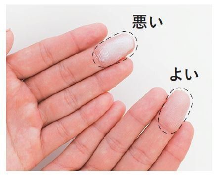パウダーを指先に取り、こすり合わせたときに、スッと溶けるように肌になじむパウダーはよいパウダー。一方、片栗粉のように硬く、白く残るパウダーは白浮きの原因になるので避けて。