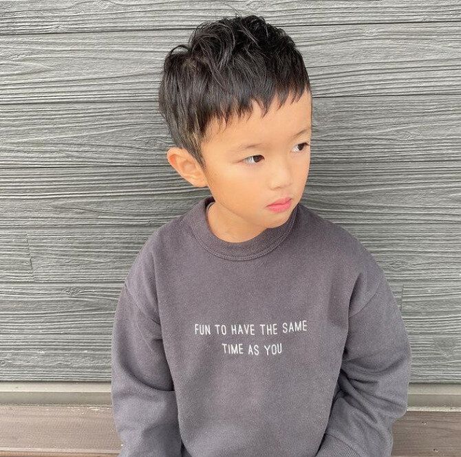 顔まわりは思いきり短くカットし、トップは長さを残しつつワックスで動きをプラスしたヘアスタイルは、スポーツマンの男の子にぴったり。わんぱくさとカッコよさ満点なので、おしゃれが気になり始めたら試してみたいスタイルです。