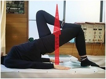 ゆっくりとお尻を持ち上げます。上の写真のように、背中から膝までがまっすぐになるように意識しながら行いましょう。その際、膝に乗せた一方の足で、体が浮かないように膝を押します。