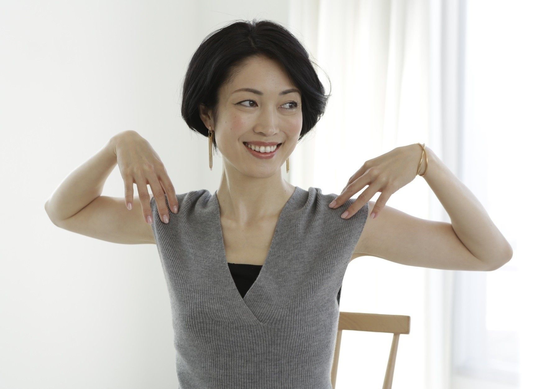 腕と胸を広げて肩甲骨を開くと、肩や首が伸びます。姿勢が悪くなっていると感じたときに行うと、背筋が伸びて気持ちがいいはず! 長時間パソコンを使ったり、事務作業をするときは、こまめに行うとよいでしょう。猫背や肩こり解消にも効果がありますよ。