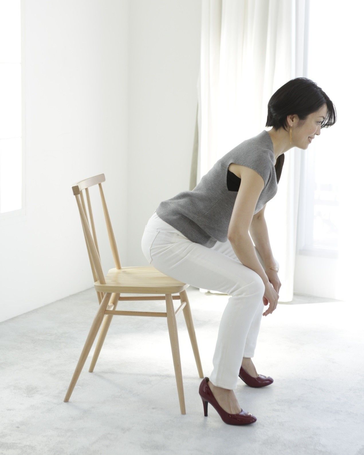 座るときにドスンと座るのではなく、股関節をゆるめながら同時進行で腰を落として座ることでスクワットをするような効果が! イスにつくとき、トイレに行ったときなど、座るたびにこれを行えば、かなりの回数になるはず。スクワットを習慣にするのはハードルが高いですが、これなら簡単! 地味な動きですが、効果は大きいですよ