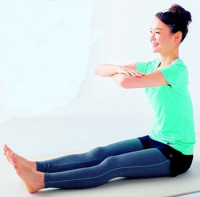 ①両足を前に出して座り、腕を肩の高さで組む。②お尻を使って、10~20歩前進する。③前進した分だけ後ろに戻る。前進・後進を1分間行う