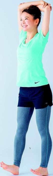 骨盤が倒れていると、足がかかと重心に。つま先を上げることで、重心を正しい位置に整え、わき腹を伸ばせば、ウエストもほっそりする効果が。①頭の後ろで両ひじをつかむ。足は腰幅に開く。②かかと立ちしながら、その場で足踏みを。1分続ける。